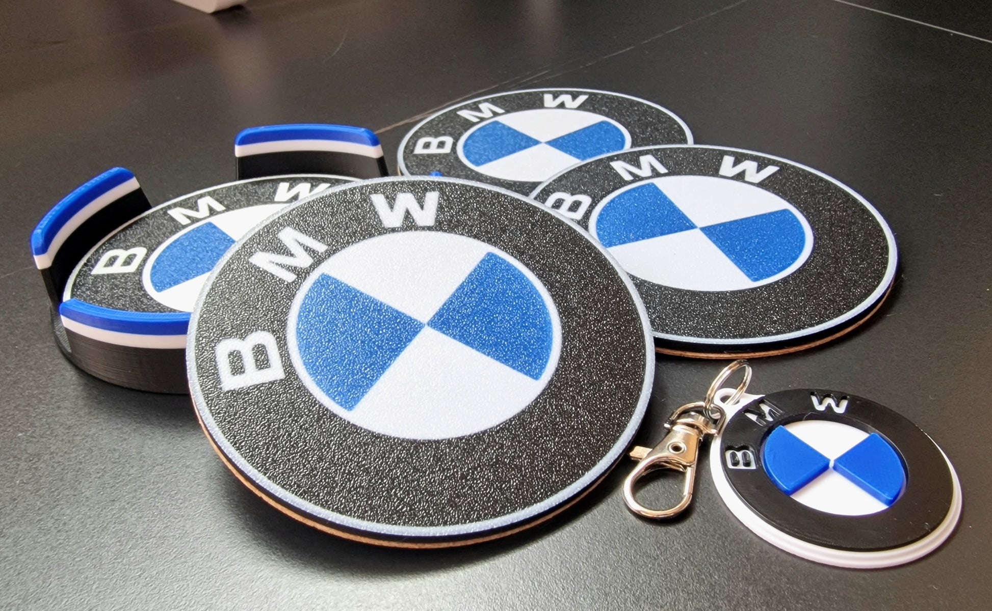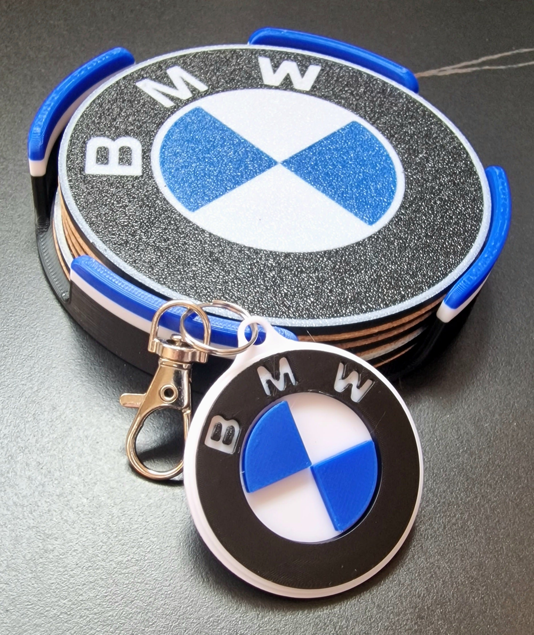 BMW Coaster & Keyring Gift Set – Desk & Home Accessories (Black, White & Blue)