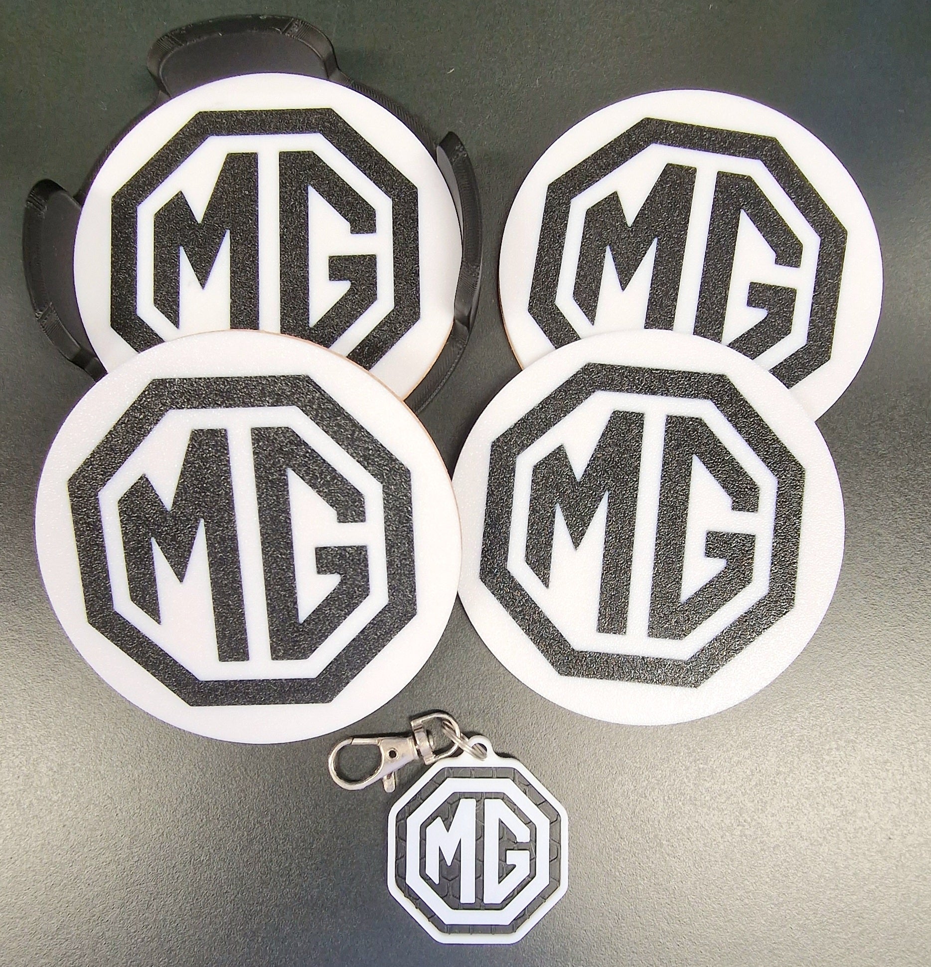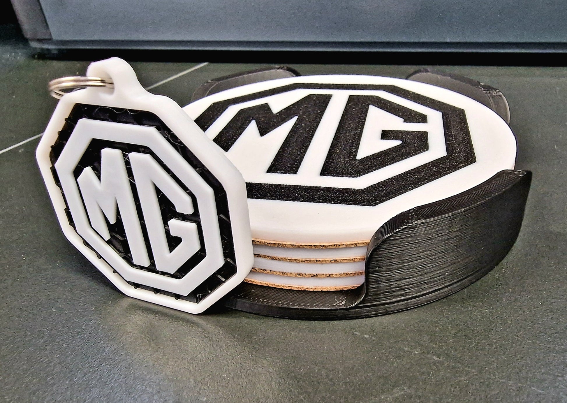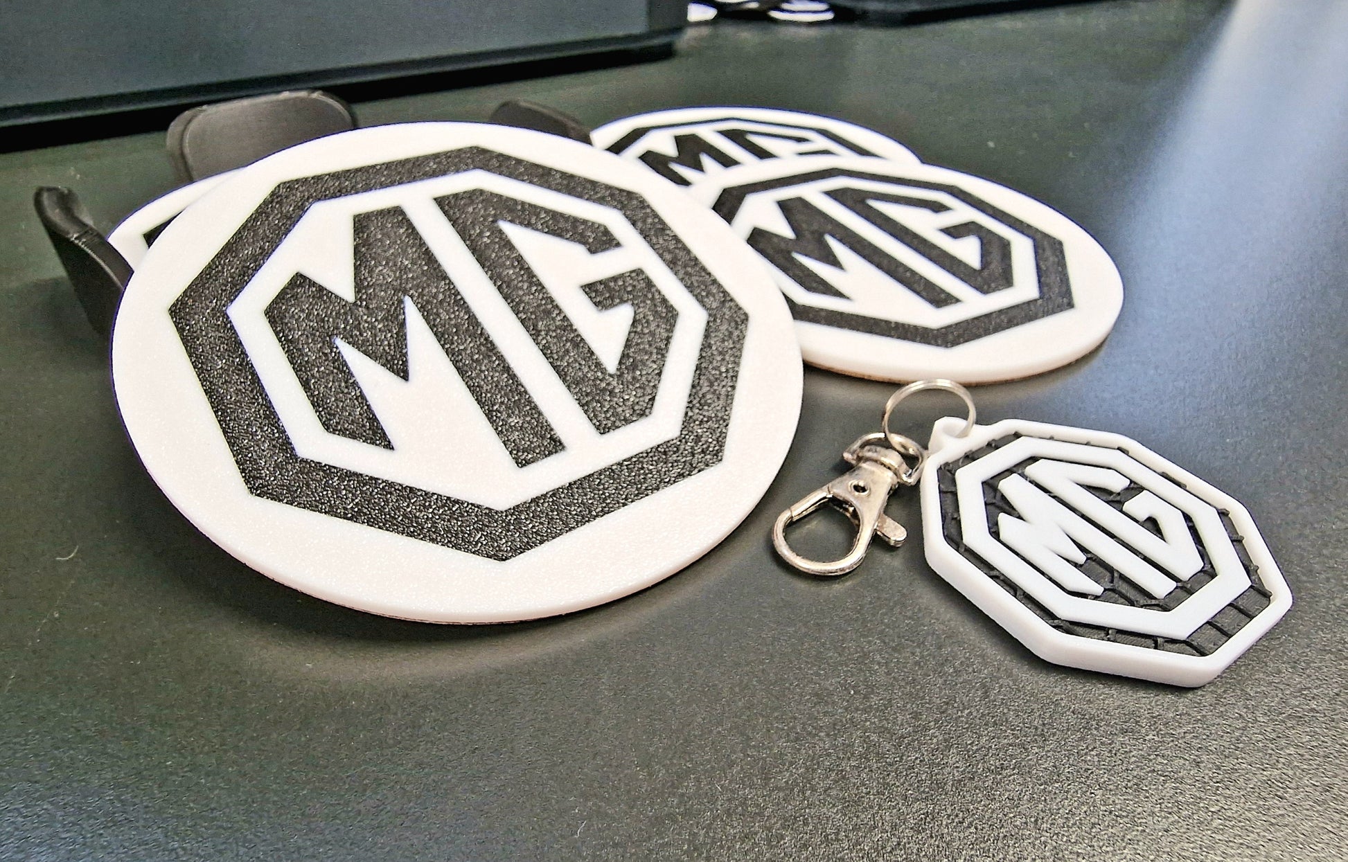 MG Coaster & Keyring Gift Set – 3D Printed Desk & Home Accessories (Black & White)